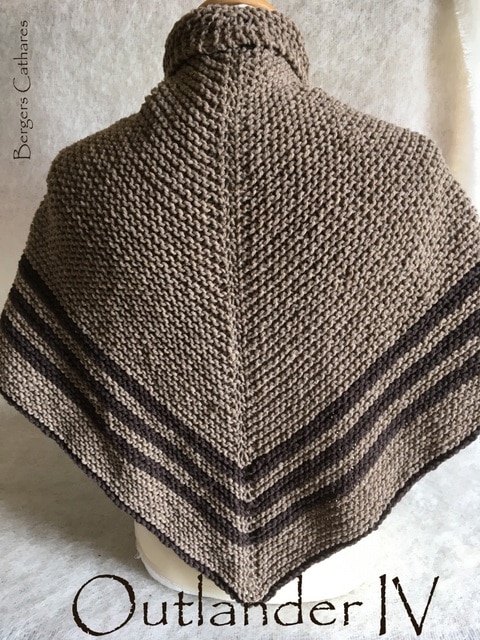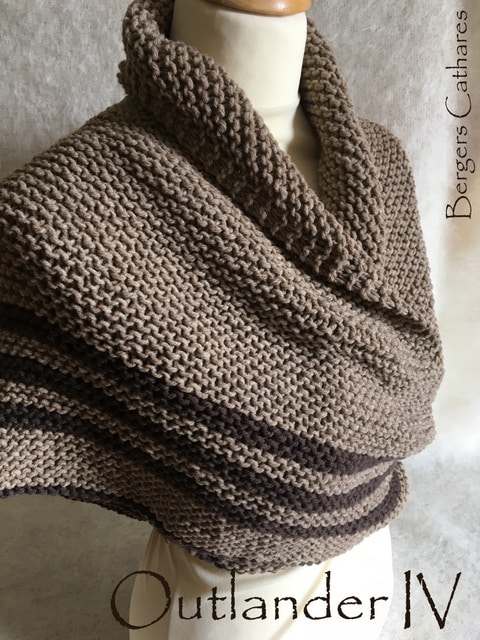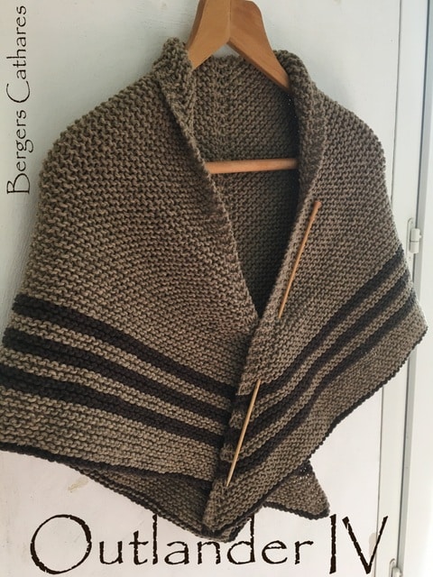 Ce châle a été créé à partir du châle porté par « Claire » dans la célèbre série « Outlander » sur l’Ecosse. Il ne vous a pas échappé que dans cette série, tous les vêtements tricotés sont superbes, la matière noble qu’est la laine est à l’honneur et le châle aussi. Comme Claire, portez le châle noué dans le dos.