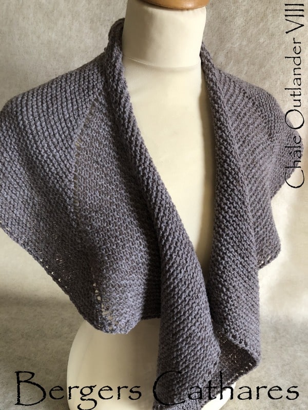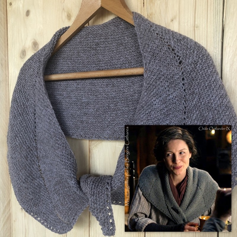 Voici un châle porté par Claire dans la célébrissime série télé Outlander, c’est un modèle petit châle simple à fermer par une épingle à châle (par ici>>). D’après toutes les photos et le film, nous l’avons mis en aiguille pour le rendre le plus proche de la réalité.