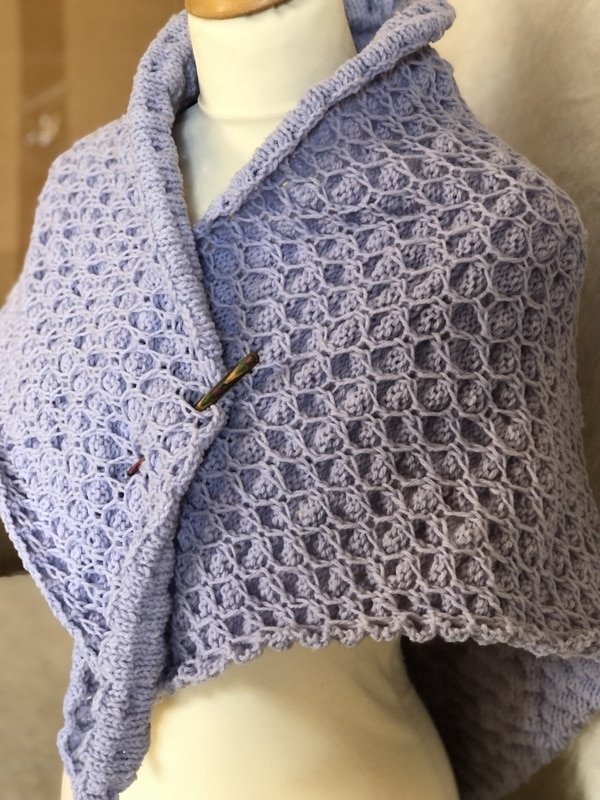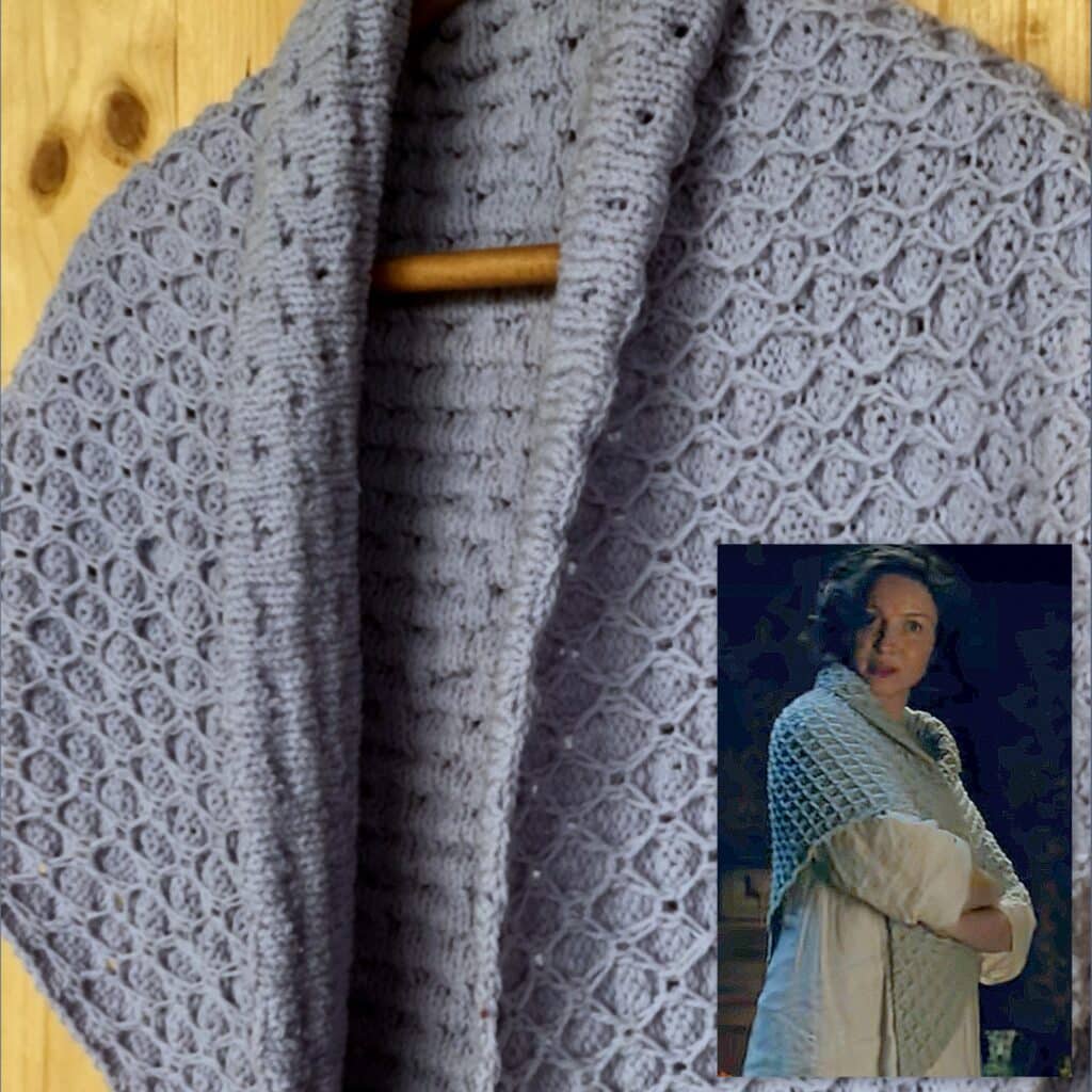 Ce châle, inspiré de la célébrissime série télé Outlander, dans la saison 6 (épisode 7), est un modèle qui se tricote avec une sorte de gros nid d’abeille. D’après toutes les photos et le film, nous l’avons mis en aiguille pour le rendre le plus proche de la réalité, il s’agit là d’une interprétation du modèle bien sûr. La pure laine qui le tricote est un fil produit par nos moutons en Ariège.