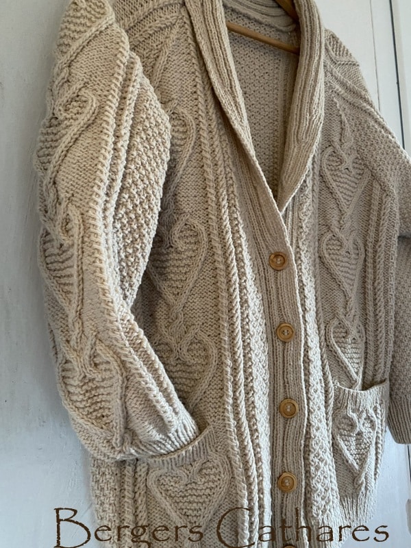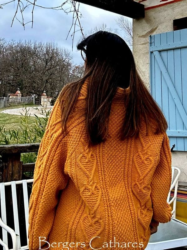Inspirée des traditions de l’Irlande et des îles d’Aran, c’est la version féminine pour les amoureuses et fan des cœurs. Une grande veste dans laquelle Christine J. a eu envie de se glisser, et a eu l’idée de cette création.