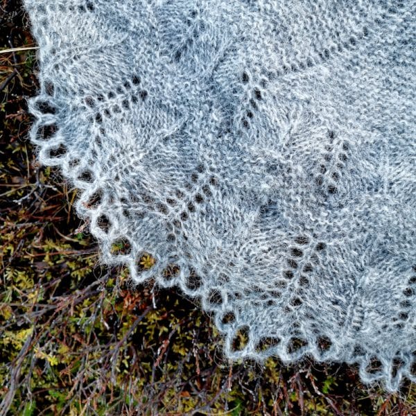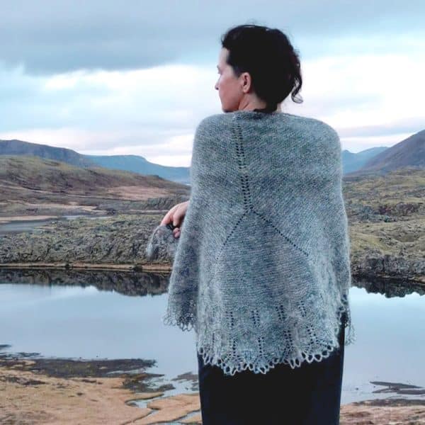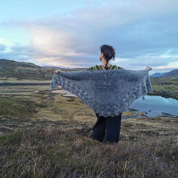 Hálfmáni commence comme un skakki, un châle triangulaire au point mousse des fjords de l’ouest d’Islande, qui commence au niveau de la nuque. Lorsque soudain, la ligne centrale d’œillets se divise en deux, modifiant radicalement la forme du châle et créant un grand hálfmáni ou demi-lune, dans lequel vous aurez envie de vous envelopper et de vous blottir