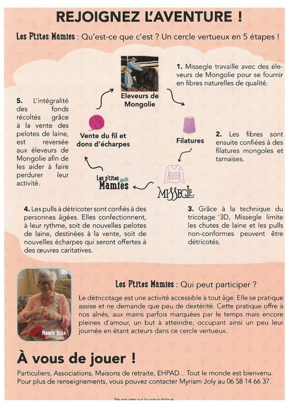 Les pelotes des P’tites Mamies : c’est l’initiative Mamie Rose qui, sous l’impulsion de sa fille Myriam, a décidé de détricoter des chutes de l’atelier Missègle, une belle Entreprise du Patrimoine Vivant, créée par Myriam Joly (atelier de tricotage de matières naturelles). Hors quand on tricote, il y a toujours des « loupés » à détricoter… et de belles fibres à récupérer : de la laine, du mohair, de l’alpaga, du yack…