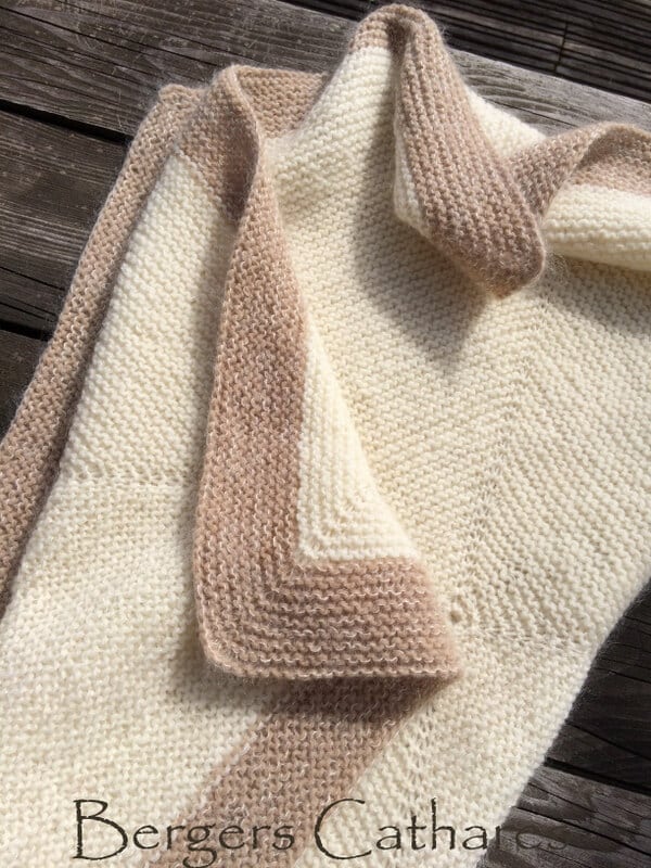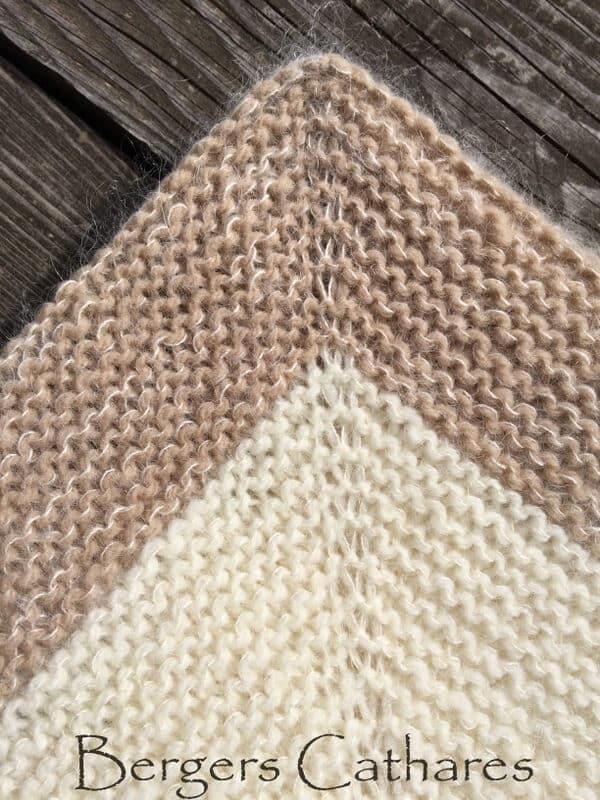 Elle est tricotée avec des aiguilles circulaires avec un mélange de deux fils : Frivole (pour la douceur) et Estive (pour le moelleux). La fiche tricot (comprise dans ce kit à tricoter) comprend 2 modèles de couvertures dont une très facile à tricoter et l’autre tricotée en circulaire.