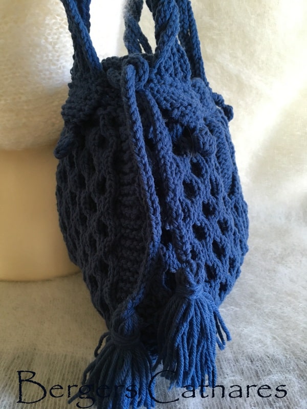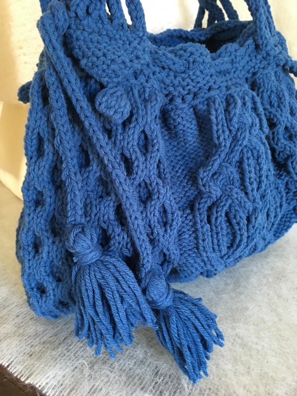Un sac tricoté façon pull irlandais dans des points très élaborés. Ses lanières sont également tricotées avec la technique Icord. Un lien prolongé de pampilles, vient le refermer.