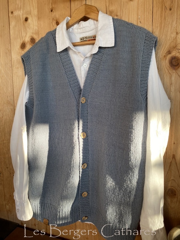 Pour les tricoteurs(ses) : Ce gilet est rapide à réaliser, il est tricoté à plat du bas vers le haut avec des longues aiguilles droites ou circulaires. On tricote au début le dos et les devant ensemble puis on termine en séparant aux emmanchures.