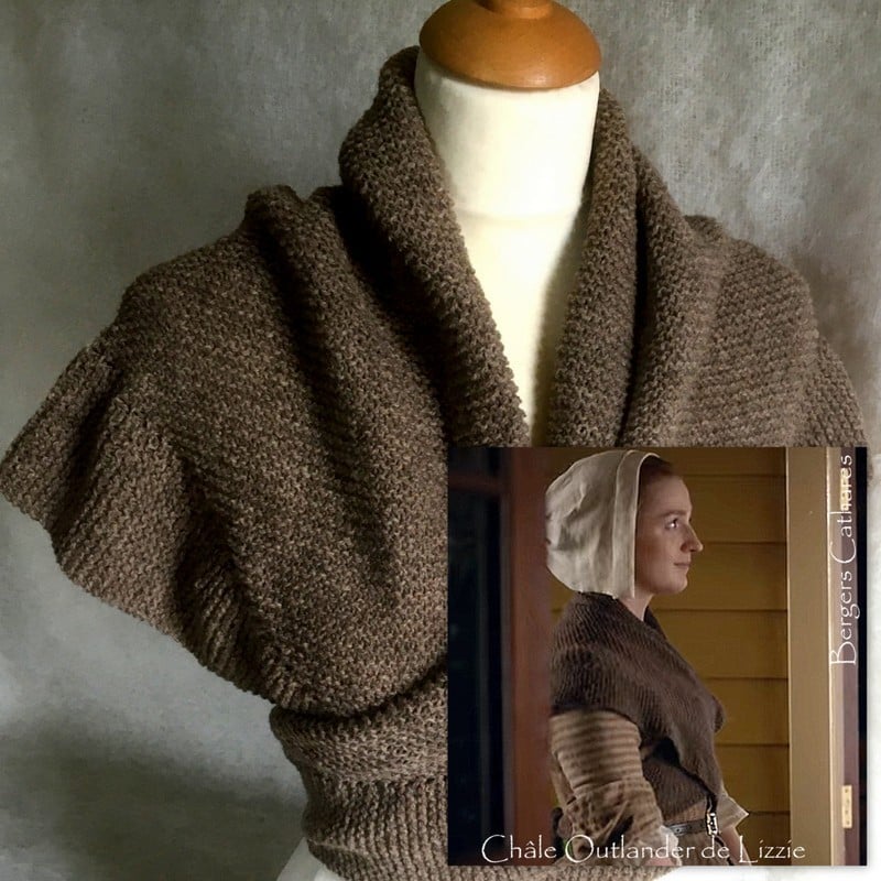Voici un châle que l’on retrouve porté par Lizzie ou par Mme Bug dans la célébrissime série télé Outlander (saison 5), c’est un modèle original avec son volant qui se porte noué dans le dos ou en écharpe. D’après toutes les photos et le film, nous l’avons interprété et mis en aiguille pour le rendre le plus proche de la réalité.