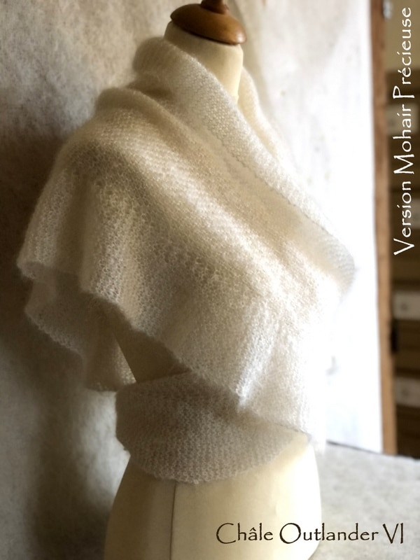 Voici un châle que l’on retrouve porté par Lizzie ou par Mme Bug dans la célébrissime série télé Outlander (saison 5), c’est un modèle original avec son volant qui se porte noué dans le dos ou en écharpe. D’après toutes les photos et le film, nous l’avons mis en aiguille pour le rendre le plus proche de la réalité.