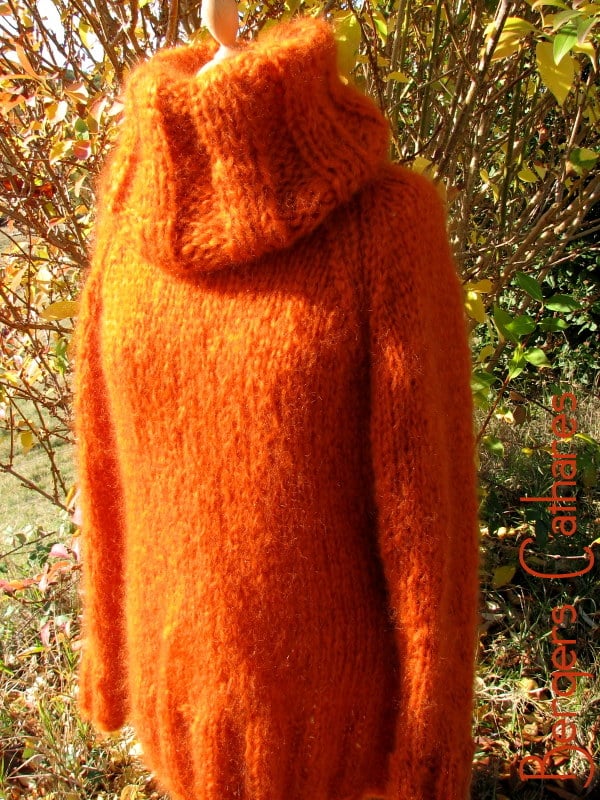 Big pull tricoté en double fil Alizé et son énOOOrme col roulé. Son col boule peut être porté de différentes façons ainsi qu’en cagoule sur la tête. Ses manches sont raglans et c’est un pull hyper mousseux et tout doudou.