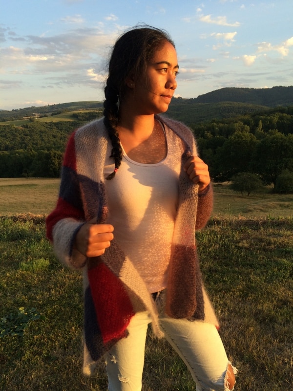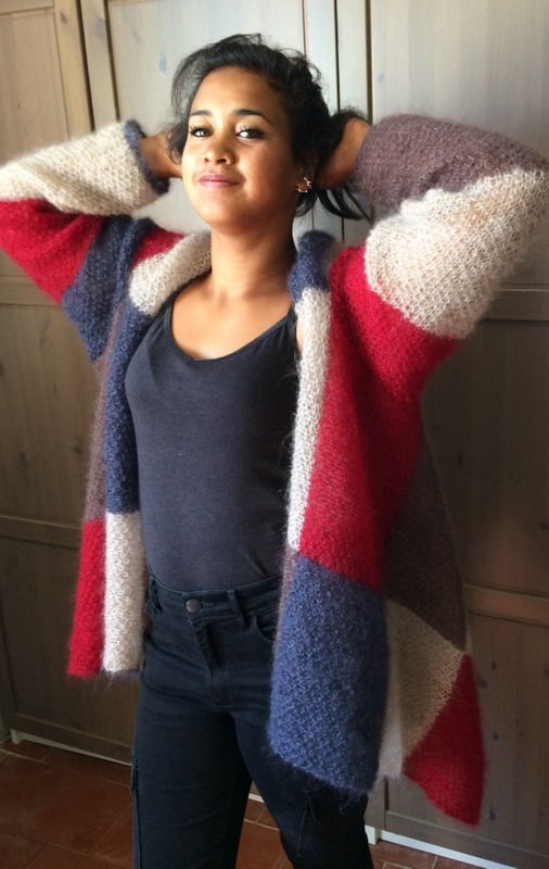 Hyper légère et moelleuse, cette veste vous réchauffera en un clin d’oeil ! Ce sont des carrés de différentes couleurs que l’on tricote en même temps. Le mohair super kid Précieuse est super agréable à tricoter et il est tout doudou. Parfois nous pouvons être en rupture dans une des couleurs de la veste, nous vous en avertissons pour un remplacement.