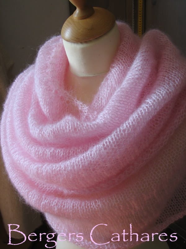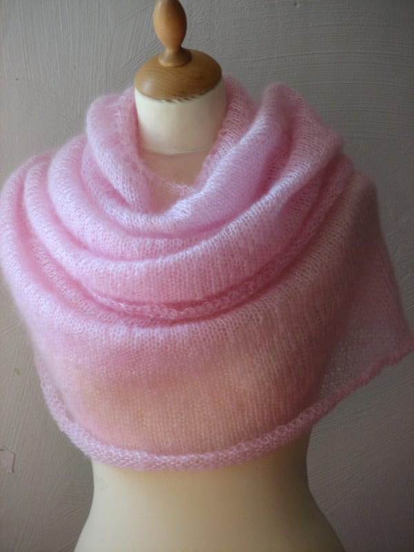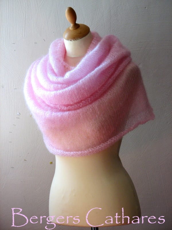 Un châle (triangle) tout simple : un voile de légèreté en mohair et soie, transparent et moelleux. Pour les tricoteuses la technique de tricot est simple mais amusante à réaliser… l’occasion de découvrir !