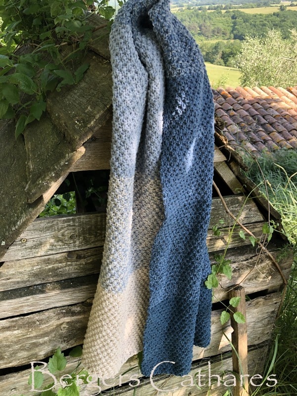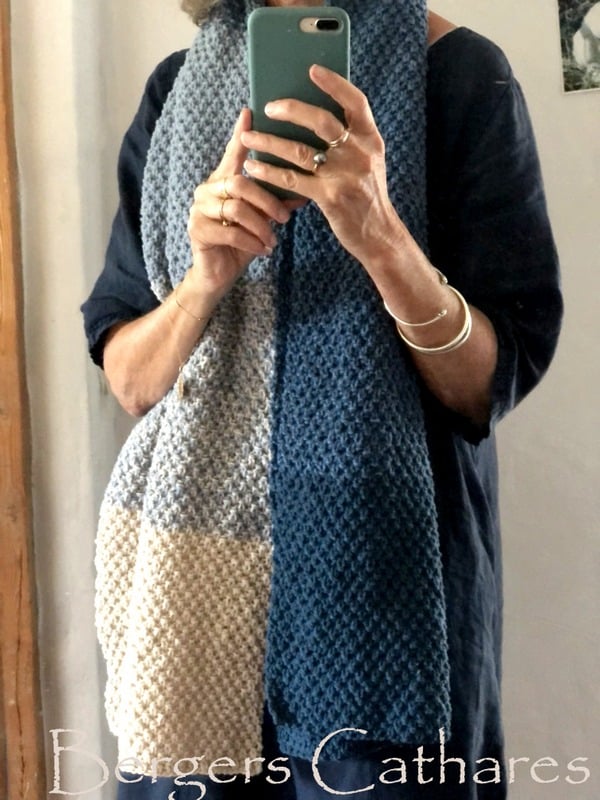 Cette grande écharpe est tricotée à la main en pure laine, produite par nos moutons en Ariège (sud de la France).
