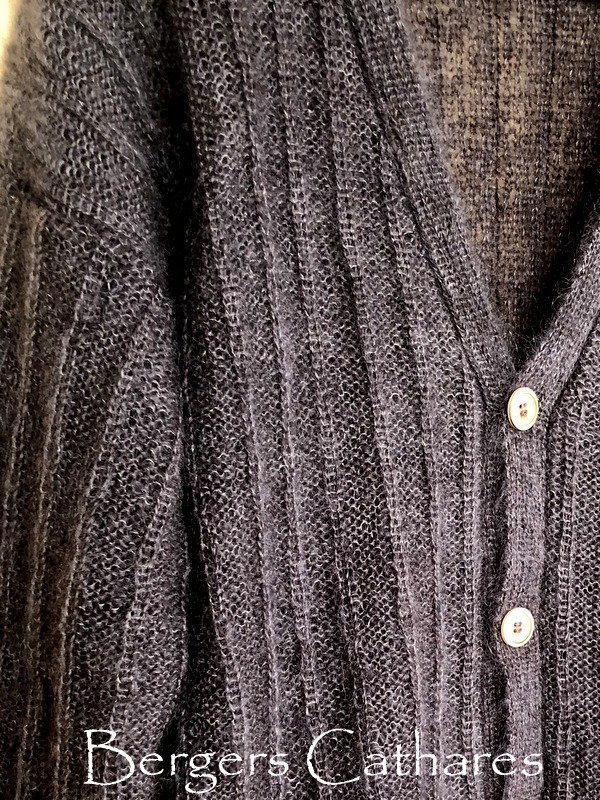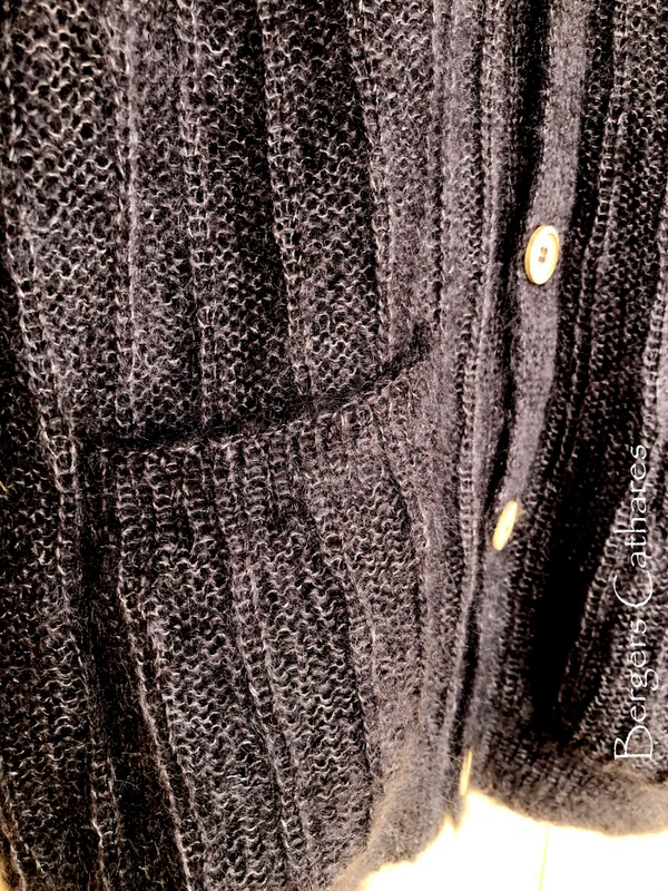 Tricoté ici en mohair et soie produit par nos chèvres en Ariège.