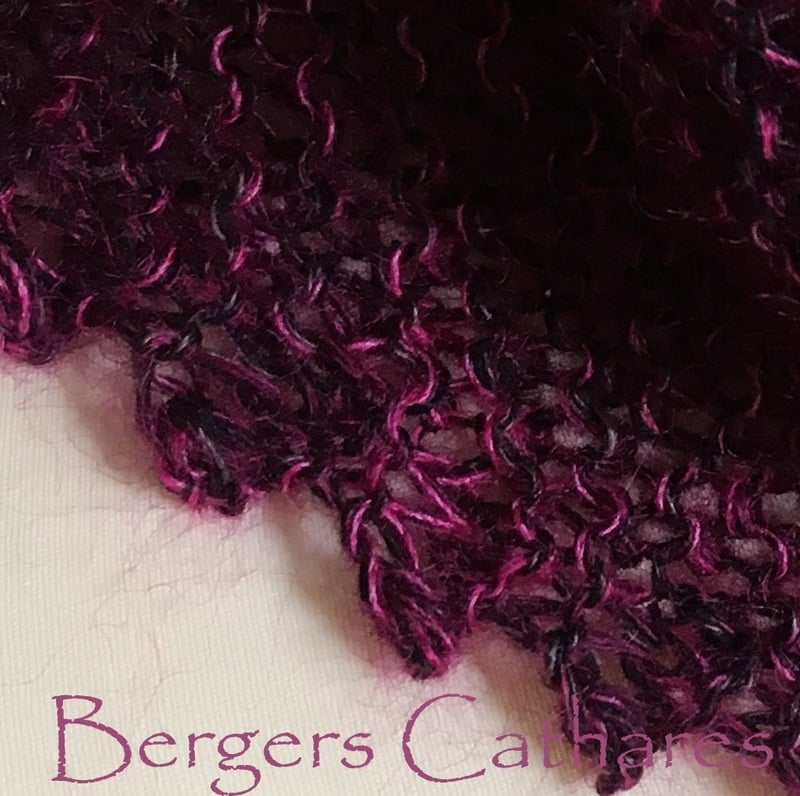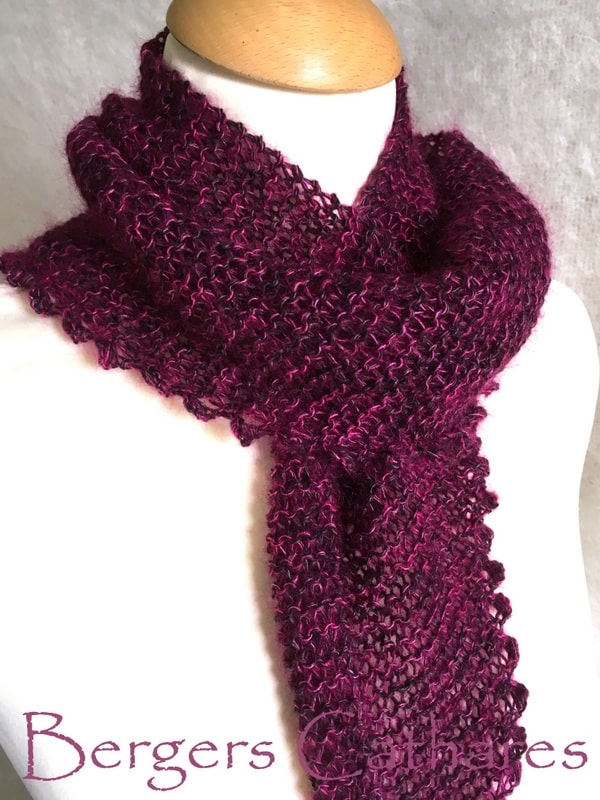 C’est un petit châle/écharpe tout doux, qui s’enroule agréablement autour du cou ou se pose délicatement sur les épaules. Il est tricoté avec un mélange de deux fils (petit aspect chiné) de mohair super kid (le luxe du mohair) et de soie naturelle. Détail intéressant : joliment souligné par une bordure dent de chats