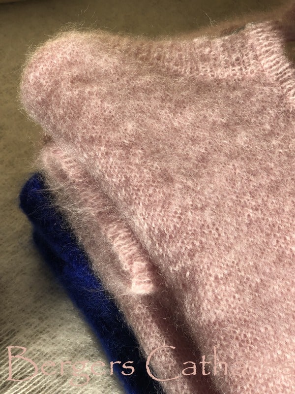 MOHAIR : Dans un grand bain d’eau tiède, mettre quelques gouttes d’une lessive très douce spéciale laine ou mohair (Eucalan est parfaite) et plongez-y votre mohair (ne jamais le laisser tremper) Rincez bien à l’eau claire (non obligatoire avec Eucalan) et essorez dans le lave-linge sans crainte. Séchage à plat, on donne bien la forme et taille de son pull, ou en sèche-linge (uniquement pour le mohair) à basse température.