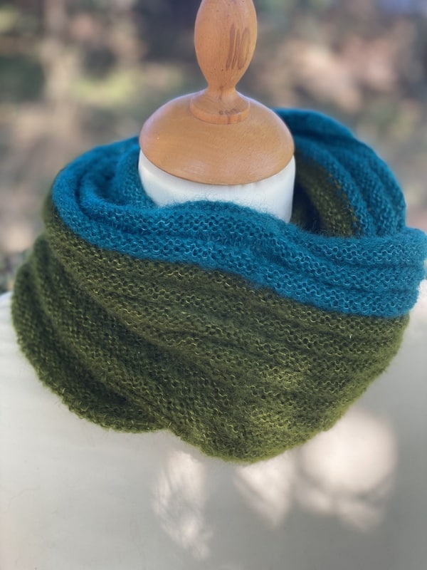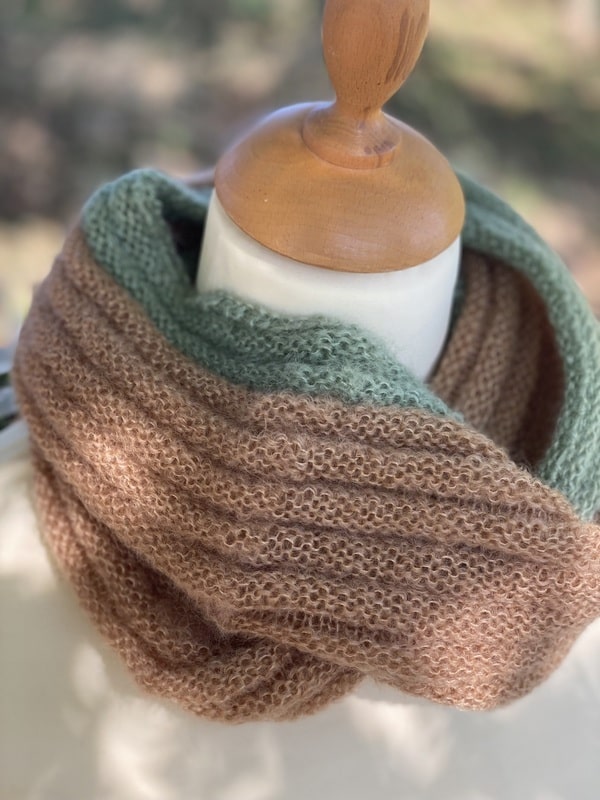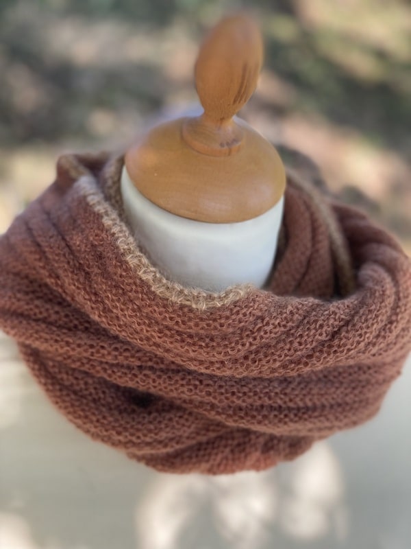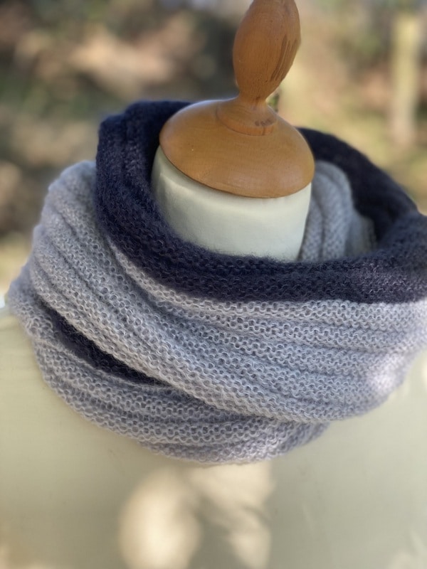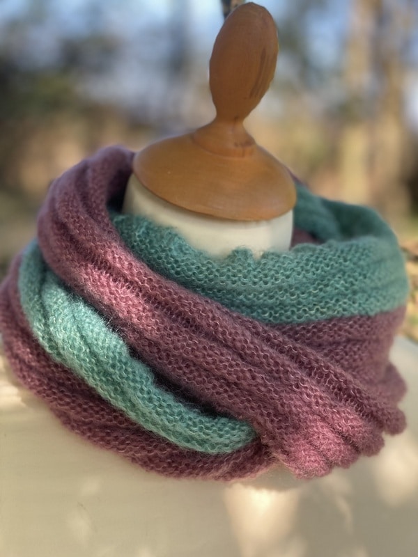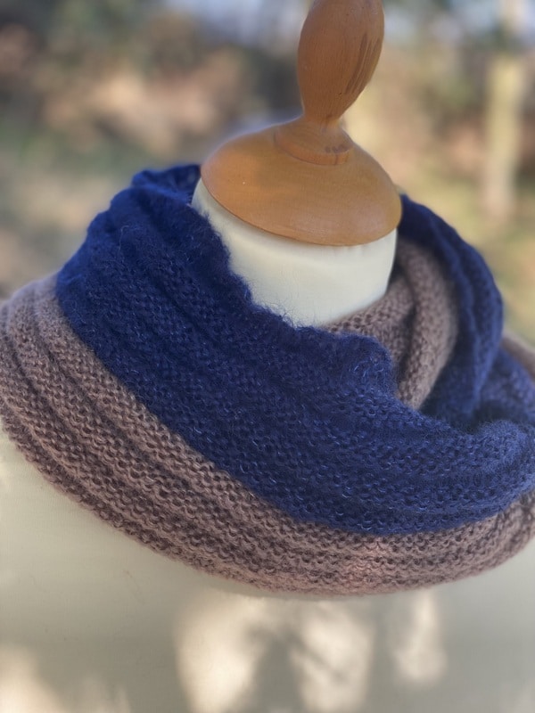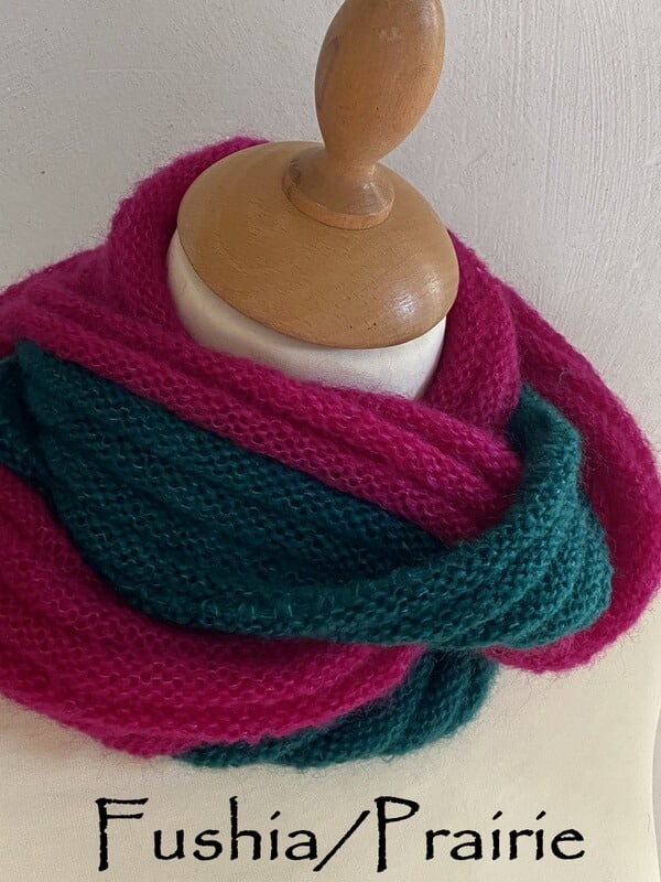 Ce snood est bicolores et chacun est unique, nous ne vous le proposerons pas 2 fois. Ils sont tricotés dans un mélange de mohair et soie (fil Précieuse) et est doublement plus épais que le snood Frivole