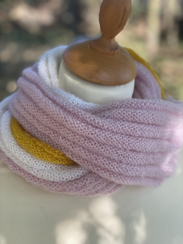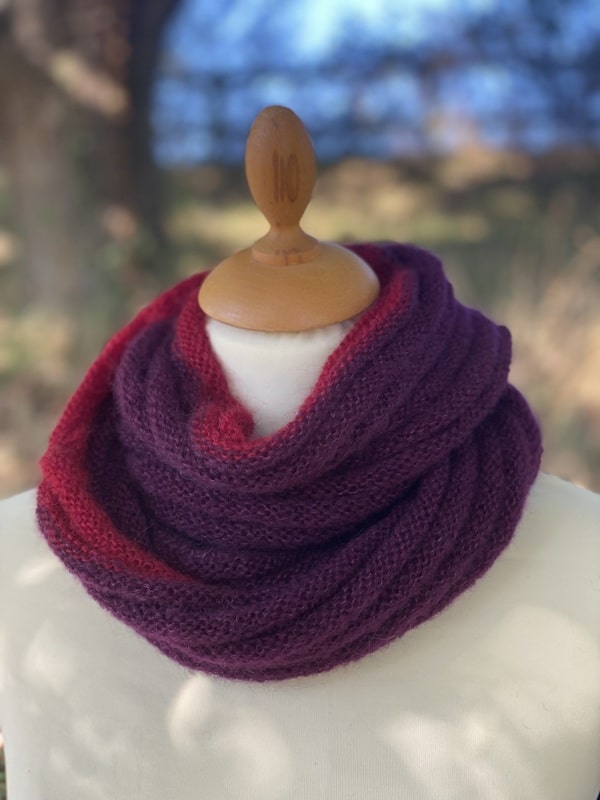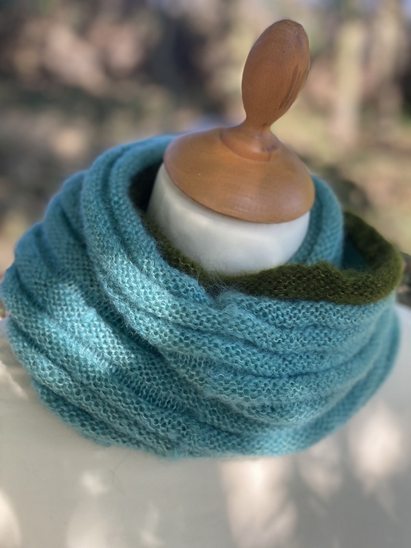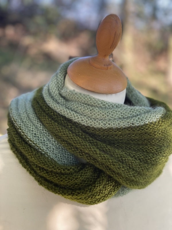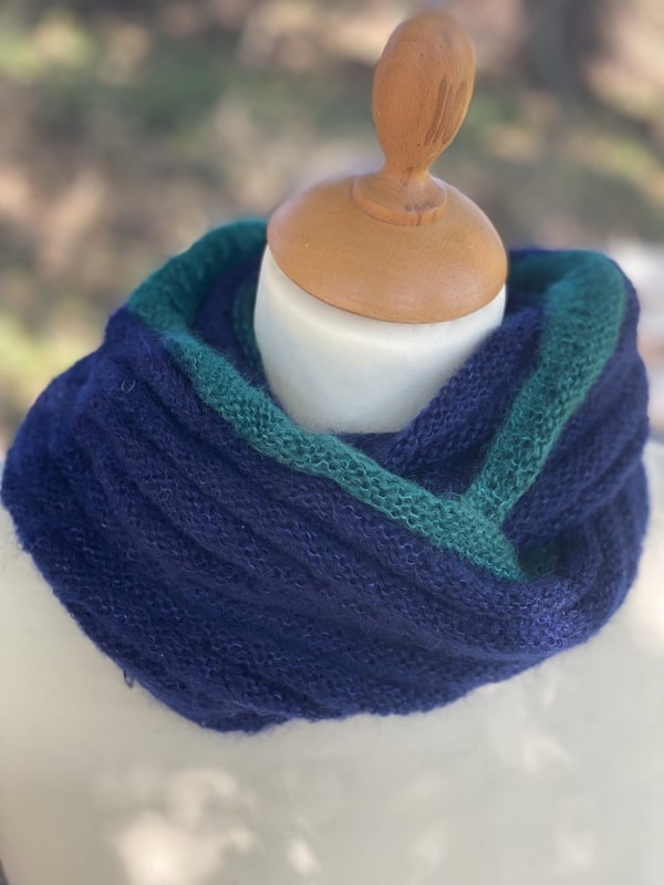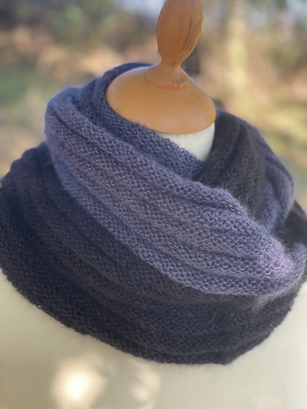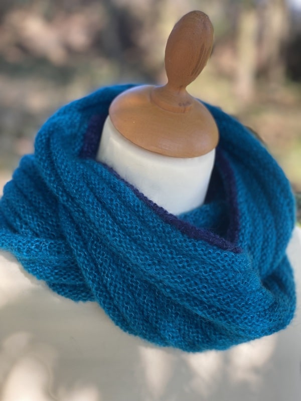 Ce snood est bicolores et chacun est unique, nous ne vous le proposerons pas 2 fois. Ils sont tricotés dans un mélange de mohair et soie (fil Précieuse) et est doublement plus épais que le snood Frivole