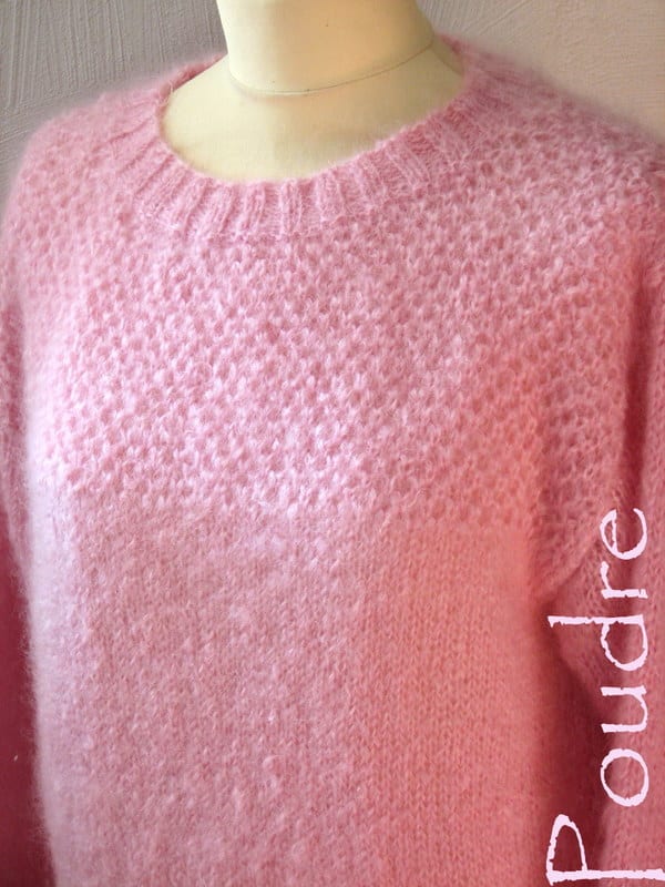 Construction « à plat » : méthode traditionnelle où l’on tricote en 4 pièces (de bas en haut) que l’on assemble ensuite. Point de jersey et empiècement en nid d’abeille