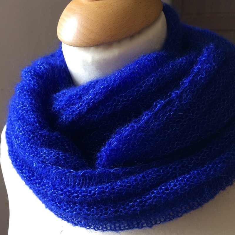 Ce snood est bicolores et chacun est unique, nous ne vous le proposerons pas 2 fois. Ils sont tricotés dans un mélange de mohair et soie (fil Précieuse) et est doublement plus épais que le snood Frivole